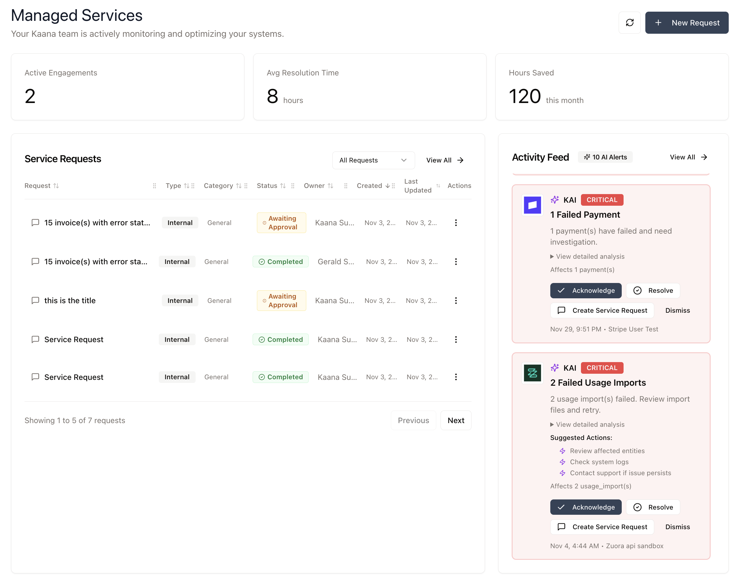 Intake and triage service requests — created directly from activity feed alerts or manually — and track them through resolution.