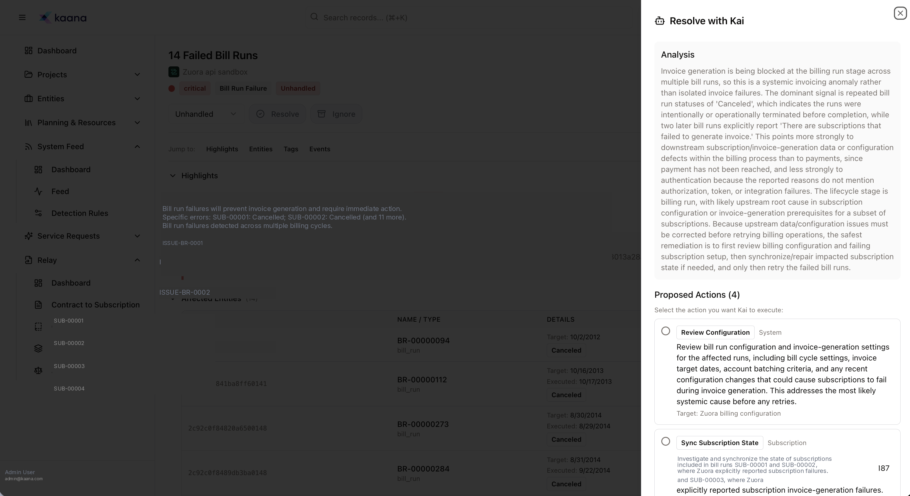 Kaana's System Feed continuously monitors your billing system for failed bill runs, invoice generation errors, payment failures, and other critical signals. Each signal is categorized by severity (critical, high, info), tagged with the business system and integration source, and linked to every affected entity.